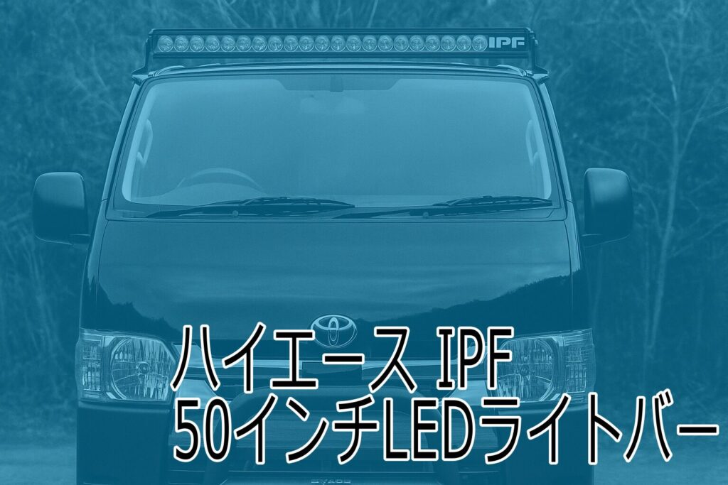 ハイエースにIPF 50インチライトバーを装着。フロントガラス上のインパクトある見た目と夜間作業での利便性をレビュー。コスト面の工夫や風切り音対策、注意点も詳しく解説します。