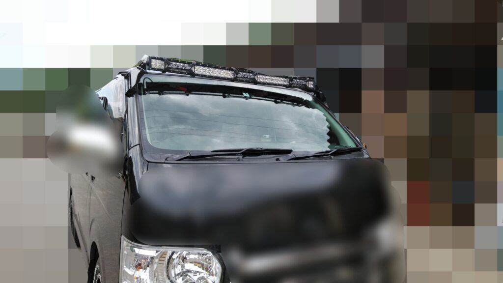 現在乗っているハイエースでは装着していませんが、以前のハイエースではフロントガラス上部にIPF製ライトブラケットを装着し、そこに50インチのLEDライトバーを取り付けていました。