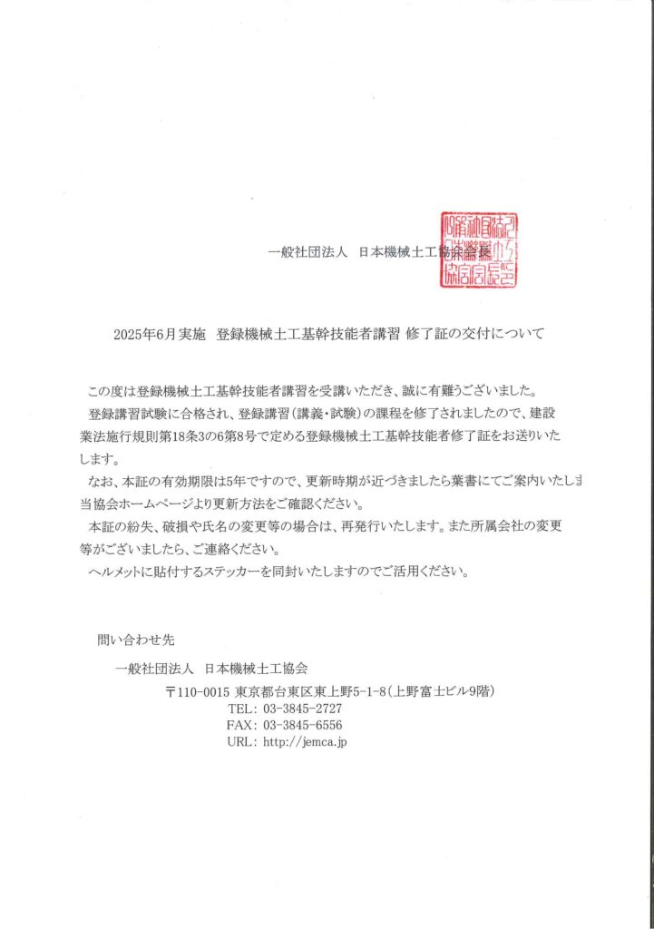 この資格は、**建設機械施工の分野で高度な知識・経験を持つ“基幹技能者”**として登録されるための講習制度です。